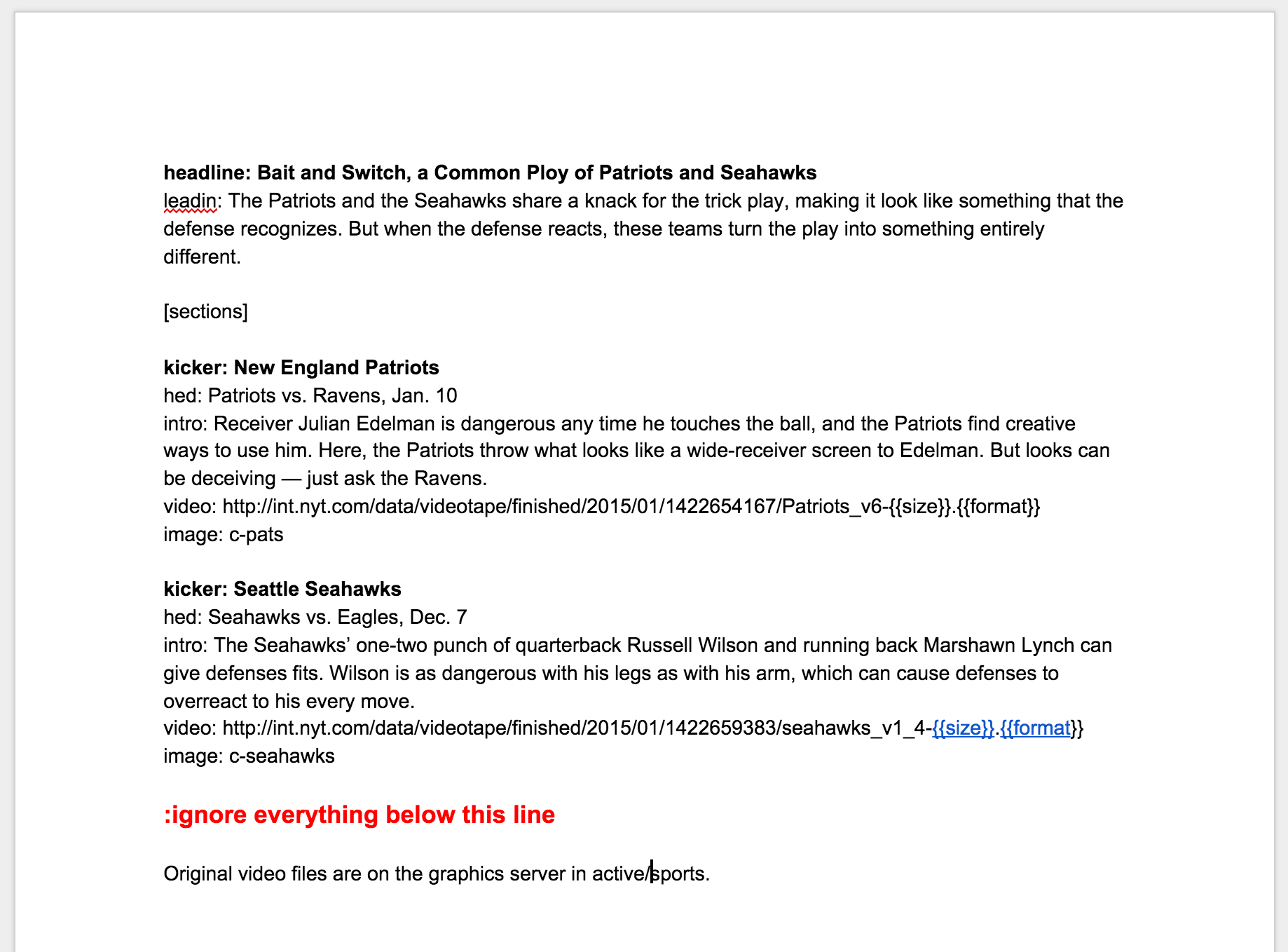 For a very simple example, here's a screenshot of the Google Doc that powers a recent graphic about the trick plays used by the New England Patriots and Seattle Seahawks: